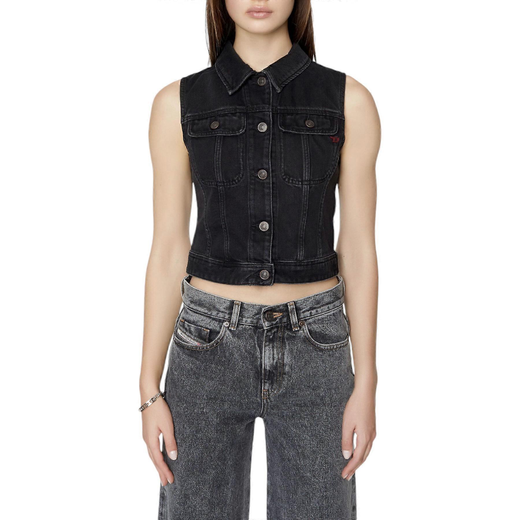 DIESEL Women's Denim Vest Style Name: DE-SLIMMY-SM Style Code: 09B88 100% Cotton Made In Tunisia Slim Fit Button Closure Embroidered Chest Logo Two Front Flap Pockets Cropped Ham Adjusters Sleeveless Colour: Black