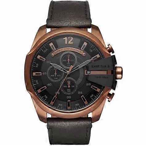 WR: 10 ATM - Case: 51 mm - Gender: Men - Case Material: SS IP Bronze - Strap Material: Leather Strap - Movement: Quartz - Functions: Chronograph - Date - Glass: Mineral - Product Type: Pendulum Clock Product Description: The Diesel DZ4459 Mega Chief is a bold men's chronograph watch that combines industrial design with modern functionality, making it a standout accessory for any occasion. Key Features: Case Material: Copper-tone stainless steel for durability and a distinctive appearance.Case Diameter: 51mm, offering a substantial wrist presence.Case Thickness: 12mm, providing a balanced profile.Dial Color: Black with luminous hands and markers for enhanced readability.Special Dial Features: Chronograph function with three sub-dials displaying 60 seconds, 30 minutes, and 24 hours.Crystal: Scratch-resistant mineral crystal protects the dial from everyday wear.Movement: Quartz chronograph movement ensures precise timekeeping.Strap Material: Black leather strap for comfort and style.Strap Width: 26mm, complementing the case size.Clasp Type: Buckle clasp for secure fastening.Water Resistance: 10 ATM (100 meters / 330 feet), suitable for swimming and snorkeling.Additional Features: Date display between the 4 and 5 o'clock positions.SpecificationValueWR10 ATMCase51 mmGenderMenCase MaterialSS IP BronzeStrap MaterialLeather StrapMovementQuartzFunctionsChronograph - DateGlassMineralProduct TypePendulum ClockPackagingOfficial Box