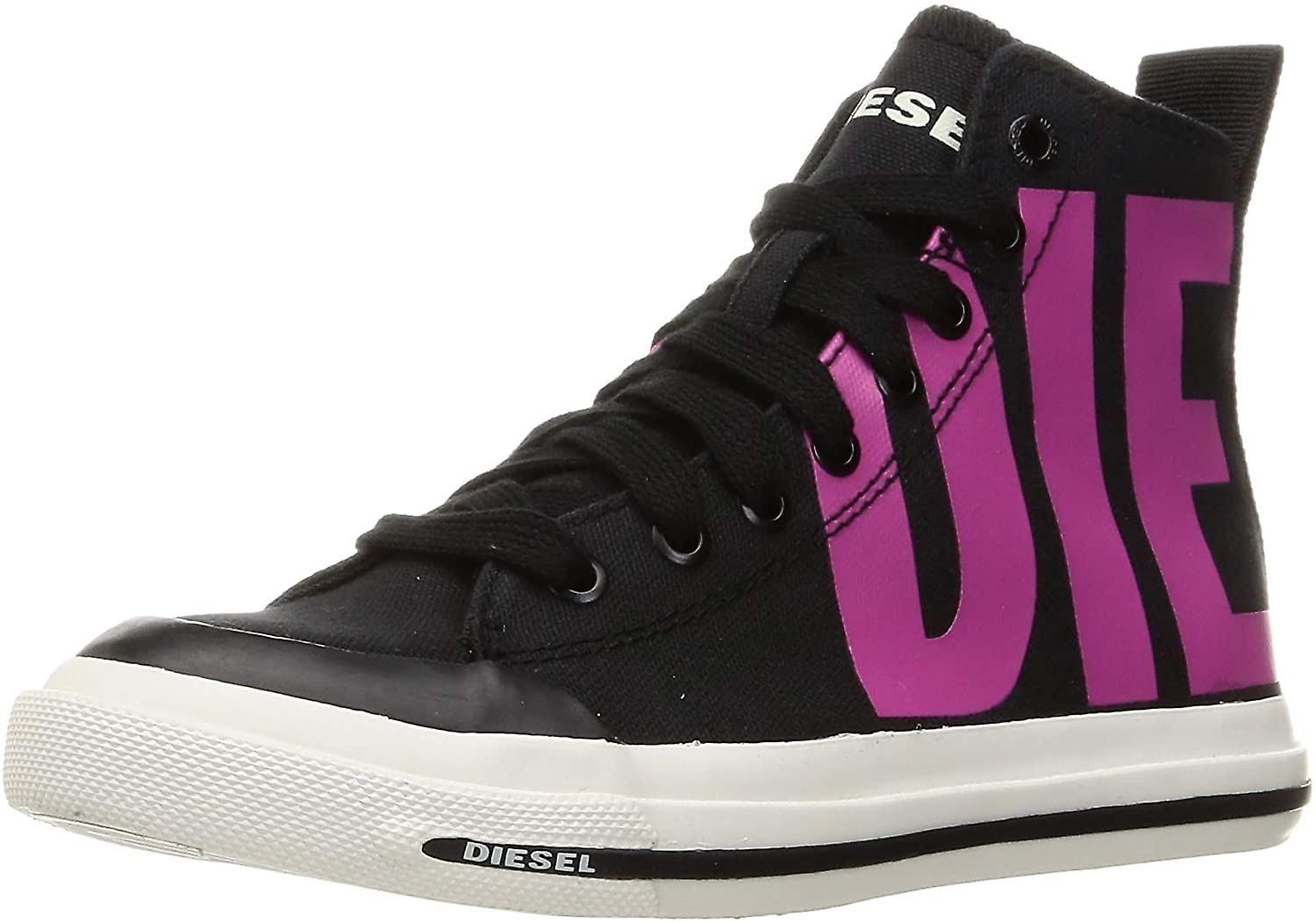 Diesel S-Astico Mid Cut Black Fuchsia Rose Womens Canvas Trainers Sneakers