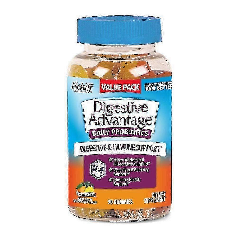 Product detailsDigestive Advantage Daily Probiotic Gummies are an easy and delicious way to get your daily probiotics. They are made with natural fruit flavors, so they are guilt free. These daily probiotic gummies help support your overall digestive and immune health.* They help lessen minor abdominal discomfort and occasional bloating.* What are probiotics? Probiotics are good bacteria that are naturally found inside the human body and help support overall health - including digestive and immune health. The probiotics found in many supplements cannot survive the harsh acids to get to the intestines where they do their work. But Digestive Advantage contains BC30, a patented probiotic that survives 100x better than leading yogurts‡ so it can give good bacteria where you need it. ٭THESE STATEMENTS HAVE NOT BEEN EVALUATED BY THE FOOD AND DRUG ADMINISTRATION. THIS PRODUCT IS NOT INTENDED TO DIAGNOSE, TREAT, CURE OR PREVENT ANY DISEASE. §vs. product offering 50 billion live cultures ‡Based on median survivability of Digestive Advantage probiotic BC30 vs leading yogurts in a simulated gastric environment."Daily Probiotic that promotes long term digestive and immune health Delicious tropical citrus flavored chewable gummies with natural fruit flavors Helps lessen minor abdominal discomfort and occasional bloating* BC30, the probiotic in Digestive Advantage, survives stomach acid 100x better than leading yogurts‡ For Adults and Kids 3 years of age and older We aim to show you accurate product information. Manufacturers, suppliers and others provide what you see here, and we have not verified it.
