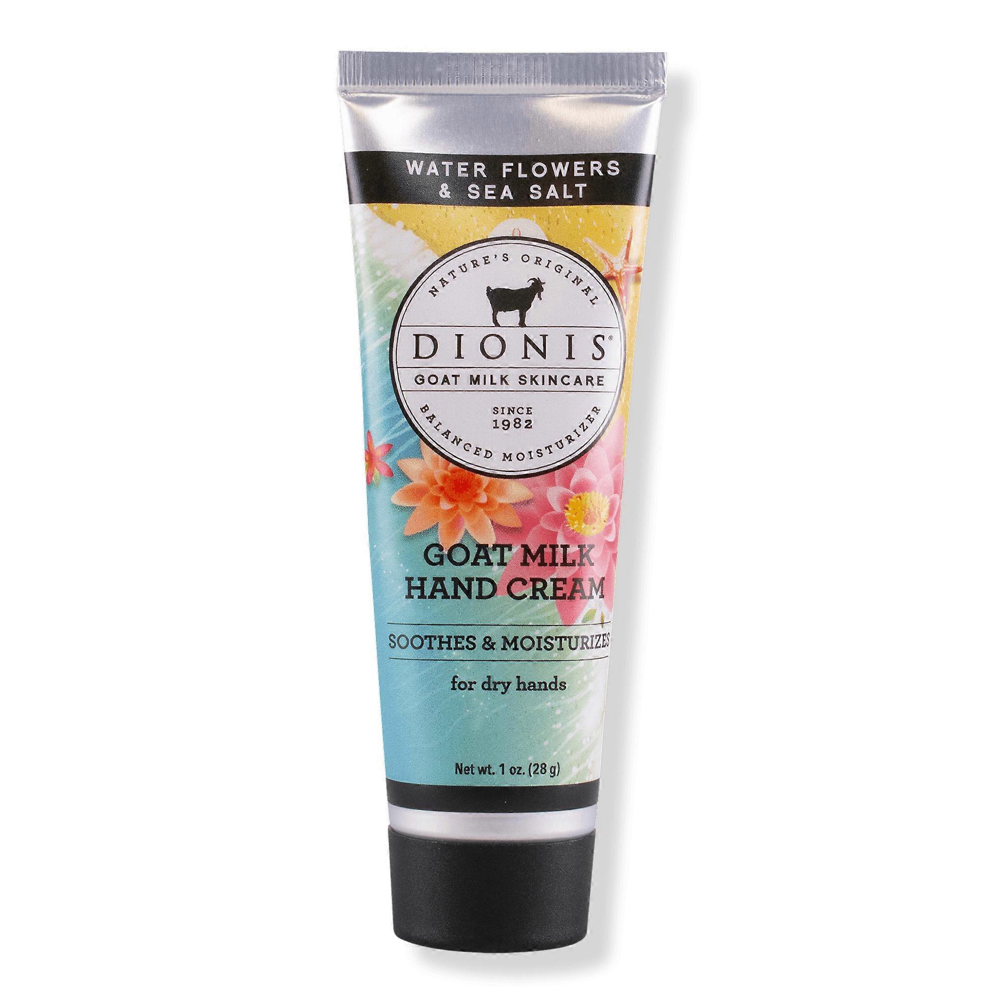 This Water Flowers & Sea Salt Hand Cream by Dionis is rich and deeply moisturizing; it will nourish and hydrate dry hands without leaving a greasy residue. Benefits Cruelty freeParaben freeNon-greasyMade with goat milkRelief for dry, thirsty handsTravel safe containerMade in the U.S.A. Features This goat milk hand cream features notes of heart of water lily, lotus and magnolia dew, complemented by fresh melon, rosewater and musk, with a kiss of sea salt. Key Ingredients Made with goat milk that is naturally enriched with high amounts of protein, fat, vitamins and minerals to nourish and help retain skin moisture. Inactive Ingredients: Aqua (Water), Isododecane, Dimethicone, Butylene Glycol, Lauroyl Lysine, Boron Nitride, Caprylic/Capric Triglyceride, Isoamyl Laurate, Propylene Glycol Dicaprylate/Dicaprate, Dimethicone Crosspolymer, Disteardimonium Hectorite, PEG-10 Dimethicone, Sodium Chloride, Cetyl PEG/PPG-10/1 Dimethicone, Ethylhexylglycerin, Methicone, Sodium Dehydroacetate, Mica, Caprylyl Glycol, Tocopheryl Acetate, Ascorbyl Tetraisopalmitate, Pentaerythrityl Tetra-Di-T-Butyl Hydroxyhydrocinnamate, Palmaria Palmata Extract, Phenoxyethanol. May Contain: CI 19140 (Yellow 5, Yellow 5 Lake), CI 42090 (Blue 1 Lake), CI 77007 (Ultramarines), CI 77491, CI 77492, CI 77499 (Iron Oxides), CI 77510 (Ferric Ferrocyanide, Ferric Ammonium Ferrocyanide), CI 77742 (Manganese Violet), CI 77891 (Titanium Dioxide). N° 15558. Product ingredient listings are updated periodically. Before using a Benefit product, please read the ingredient list on the packaging of your product to be sure that the ingredients are appropriate for your personal use. Suggested Use: Gently apply to hands until absorbed. Used regularly, this rich, non-greasy formula will leave your hands feeling hydrated and moisturized. UPC: 000002503711 Weight: 0.57 lbs