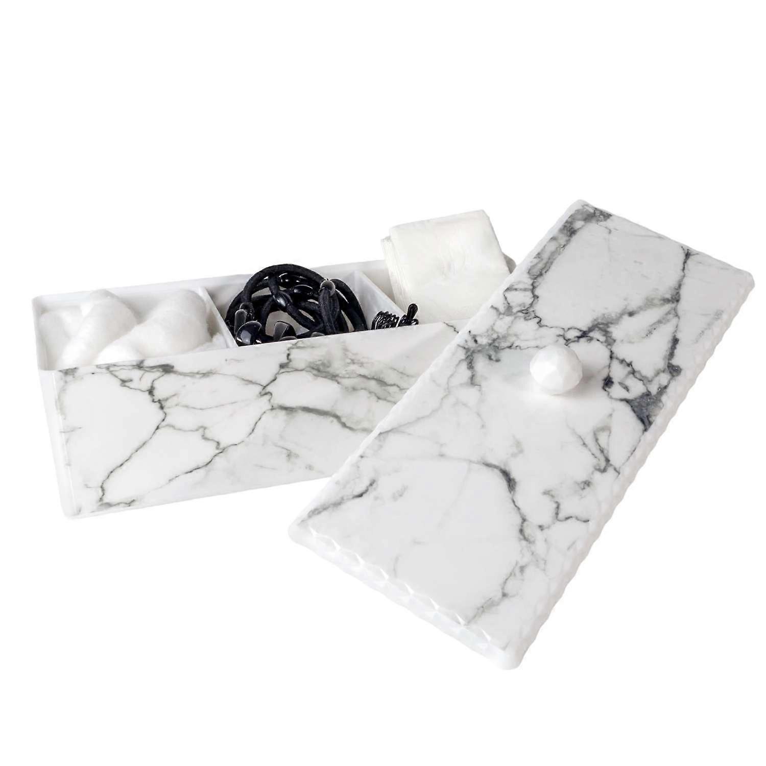 Spenderbox mit 3 Fächern und Deckel aus Kunststoff mit Marmor Optik - 23.3 x 9.4 x 9.5 cm - Aufbewahrungs Behälter Organizer für Wattestäbchen Wattepads Wattebällchen Spender