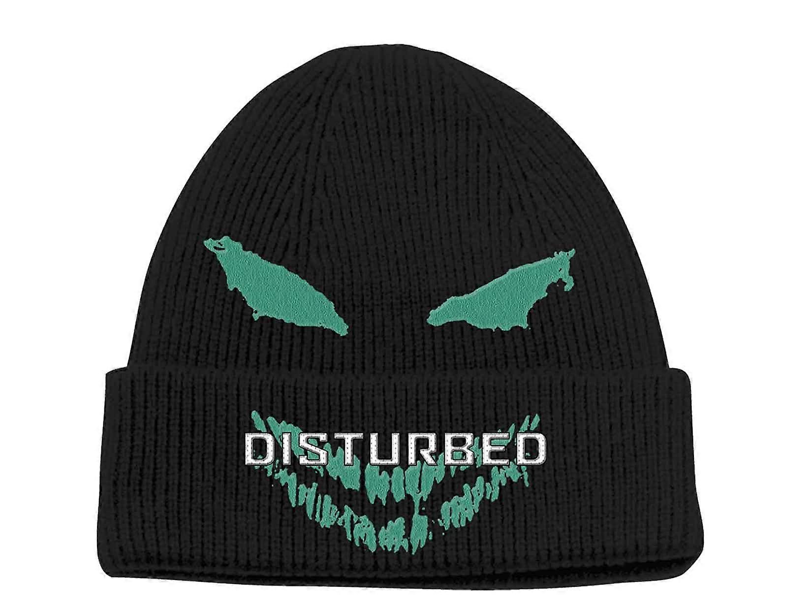 An official licensed unisex 100% Acrylic Beanie Hat featuring the Disturbed 'Green Face' design motif. This high quality headwear is available in a black colourway.