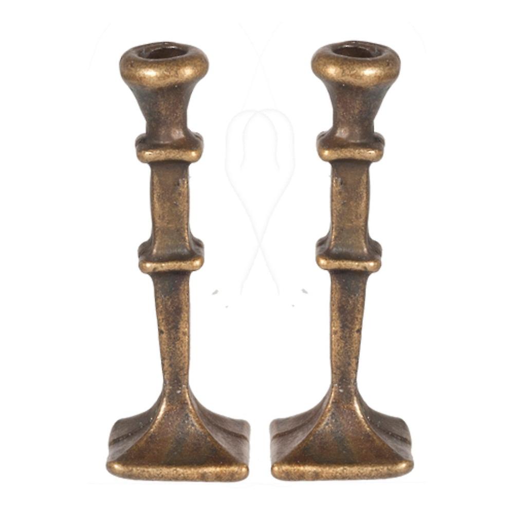 Dolls House 2 Antique Brass Candlesticks Square Base Miniature 1:12