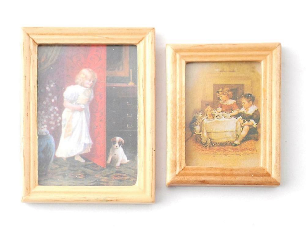 Dolls House 2 Child & Pet Pictures Paintings In Wooden Frame Miniature Accessory