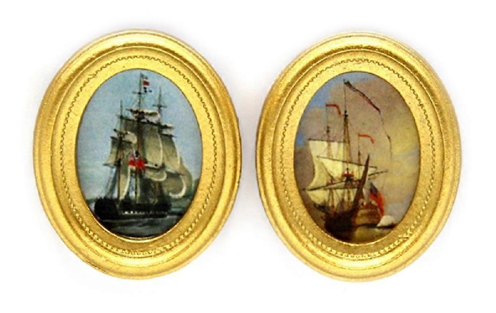 Dolls House 2 Naval Ship Paintings Pictures Oval Gold Frames Miniature Accessory