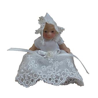 Dolls House Baby In White Lace Dress & Bonnet Miniature 1:12 Porcelain People
