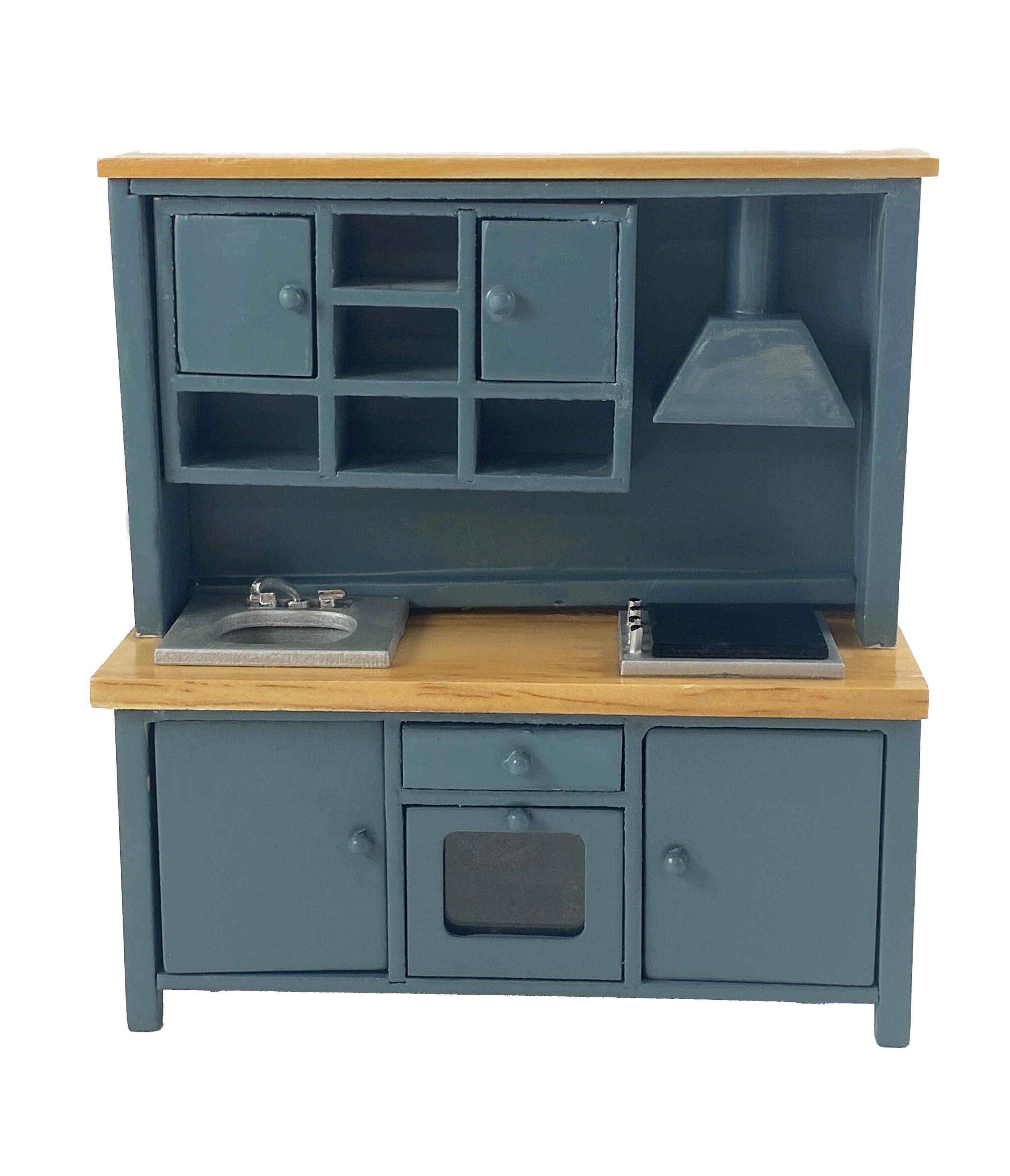 Dolls House Blue & Oak Complete Modern Kitchen Unit With Sink Oven Hob 1:12