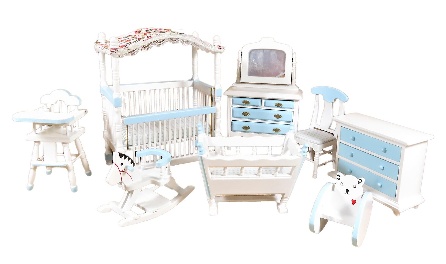 Dolls House Blue & White Nursery Furniture Set 8 Piece Miniature With Canopy Cot