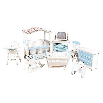 Dolls House Blue & White Nursery Furniture Set 8 Piece Miniature With Canopy Cot