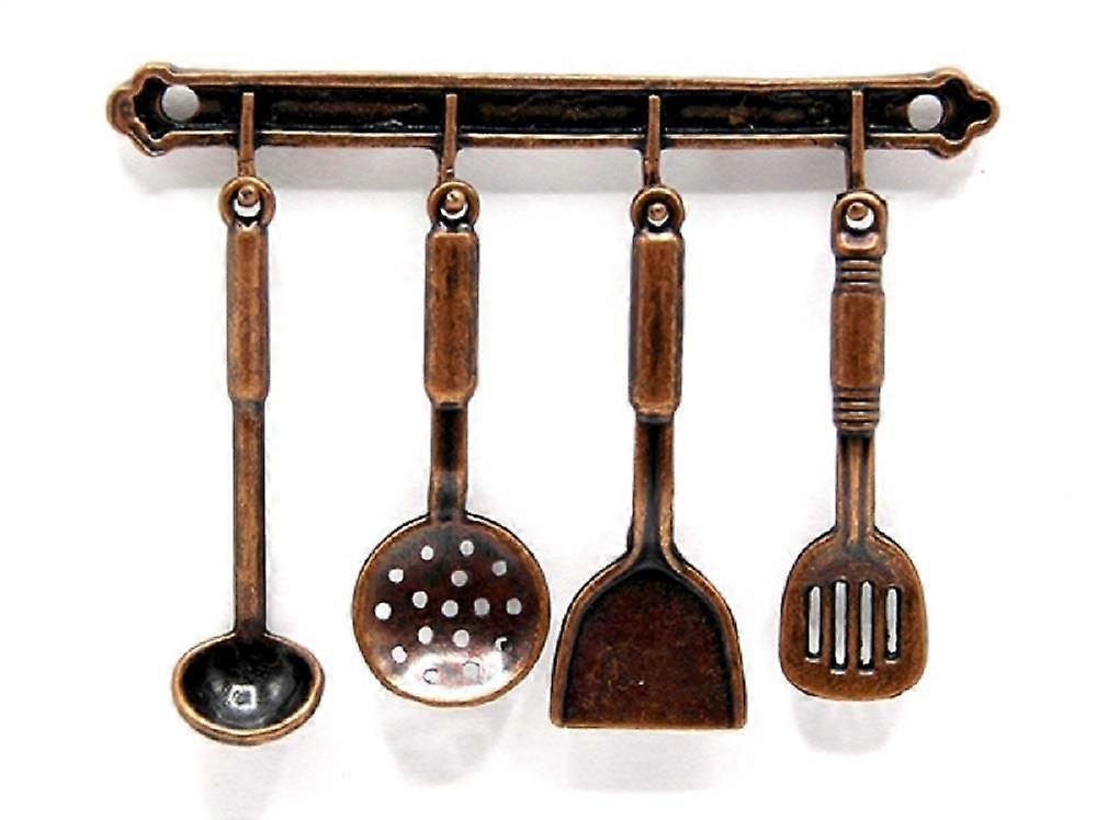 Dolls House Bronze Hanging Utensil Set & Rack Miniature 1:12 Kitchen Accessory