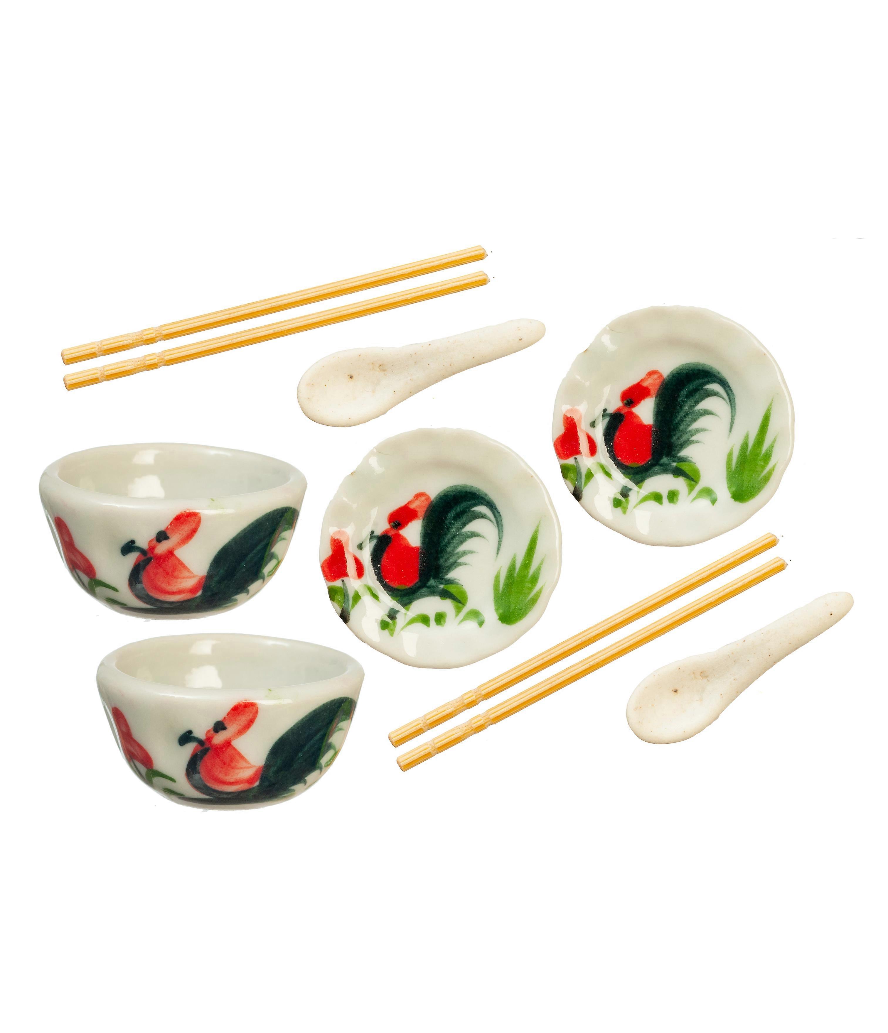 Dolls House Cockerel Dining Set Bowls Plates Chopsticks Kitchen Accessory 1:12
