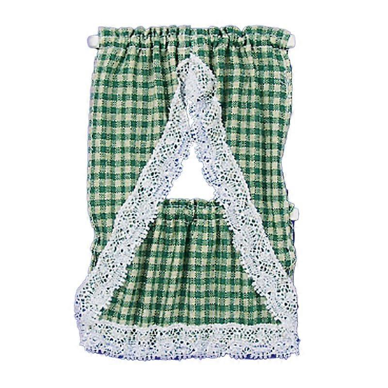 Dolls House Green Beige Gingham Country Kitchen Curtains & Valance 1:12 Scale