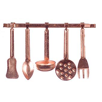 Dolls House Miniature 1:12 Scale Kitchen Accessory Copper Hanging Utensils And Rack