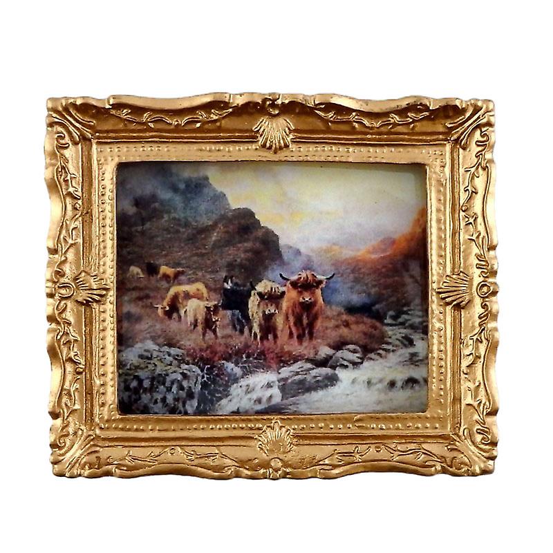 Dolls House Miniature Accessory Highland Cattle Painting Gold Frame