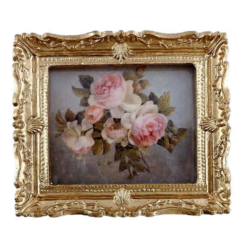Dolls House Miniature Bunch Of Pink Roses Painting Gold Frame