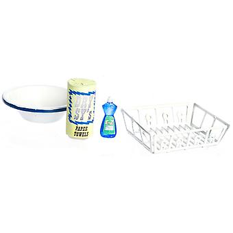 Dolls House Miniature Kitchen Accessory Washing Up Set Bowl Liquid Dish Drainer