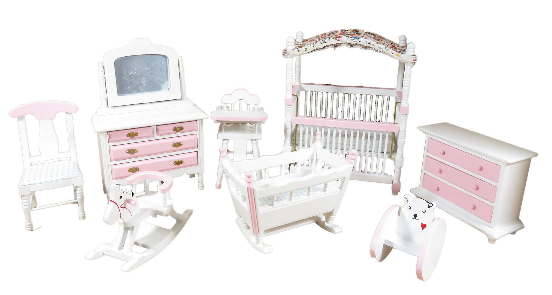 Dolls House Pink & White Nursery Furniture Set 8 Piece Miniature With Canopy Cot