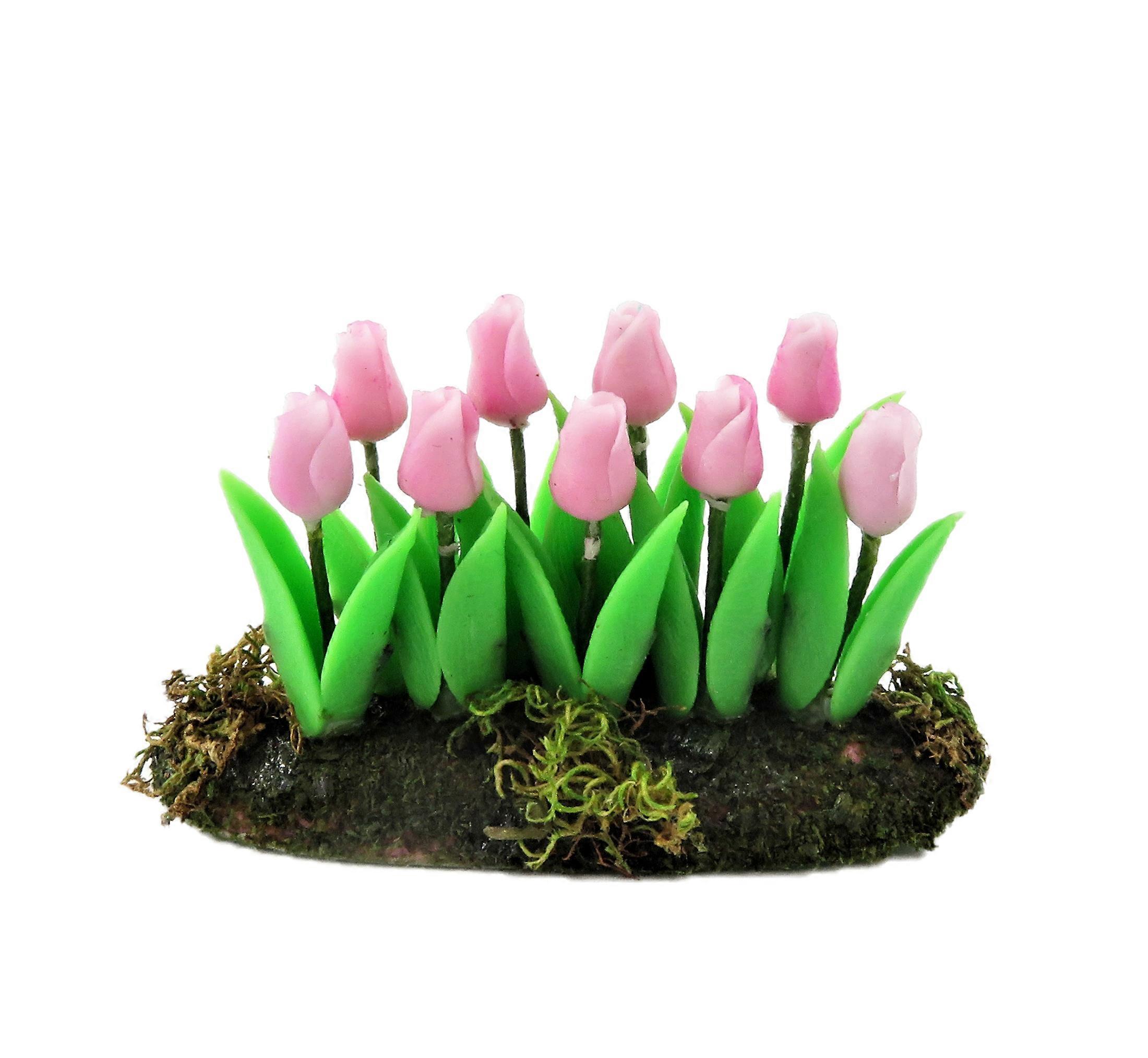 Dolls House Pink Tulips Flowers In Ground Soil Grass Miniature Garden Accessory