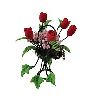 Dolls House Red & Pink Flower Display In Black Wire Basket Garden Accessory