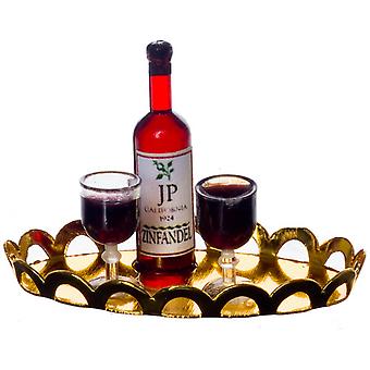 Dolls House Red Wine Bottle & 2 Full Glasses On Gold Tray Miniature