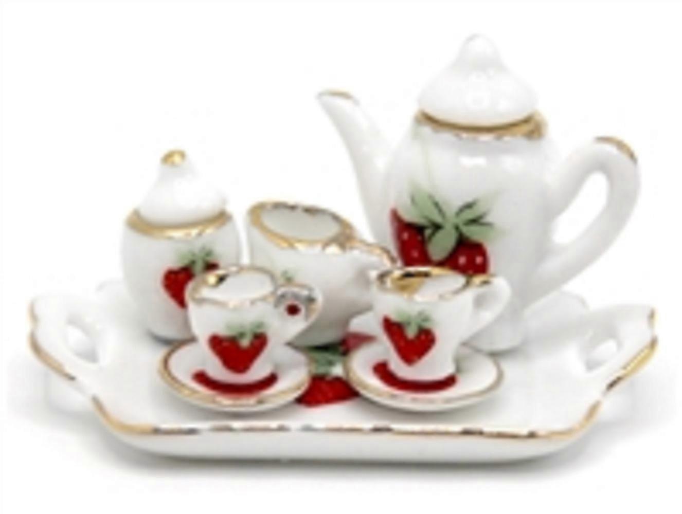 Dolls House Strawberry Tea Set Porcelain Miniature Dining Room Cafe Accessory