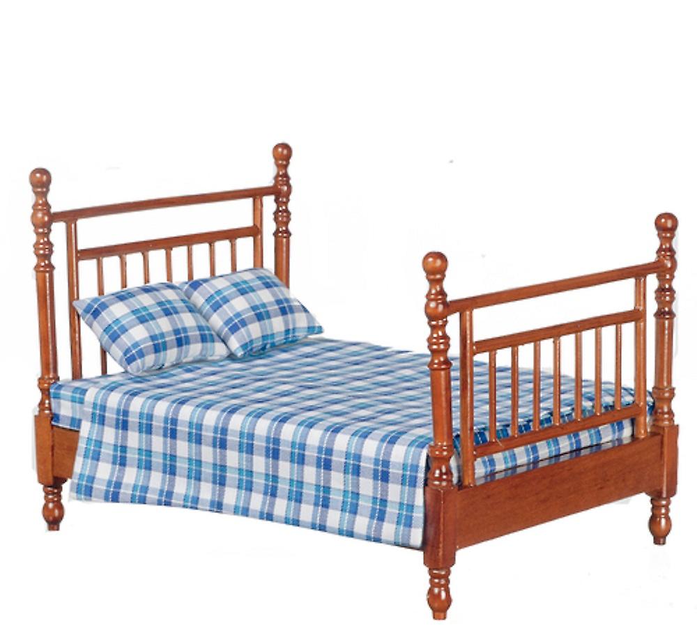 Dolls House Walnut Double Bed Blue Check Bedding Miniature Bedroom Furniture
