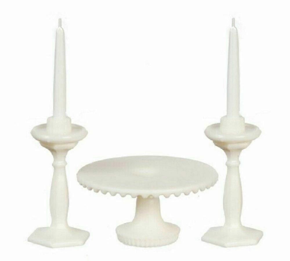 Dolls House White Cake Stand & Candlesticks Miniature Dining Room Accessory Set