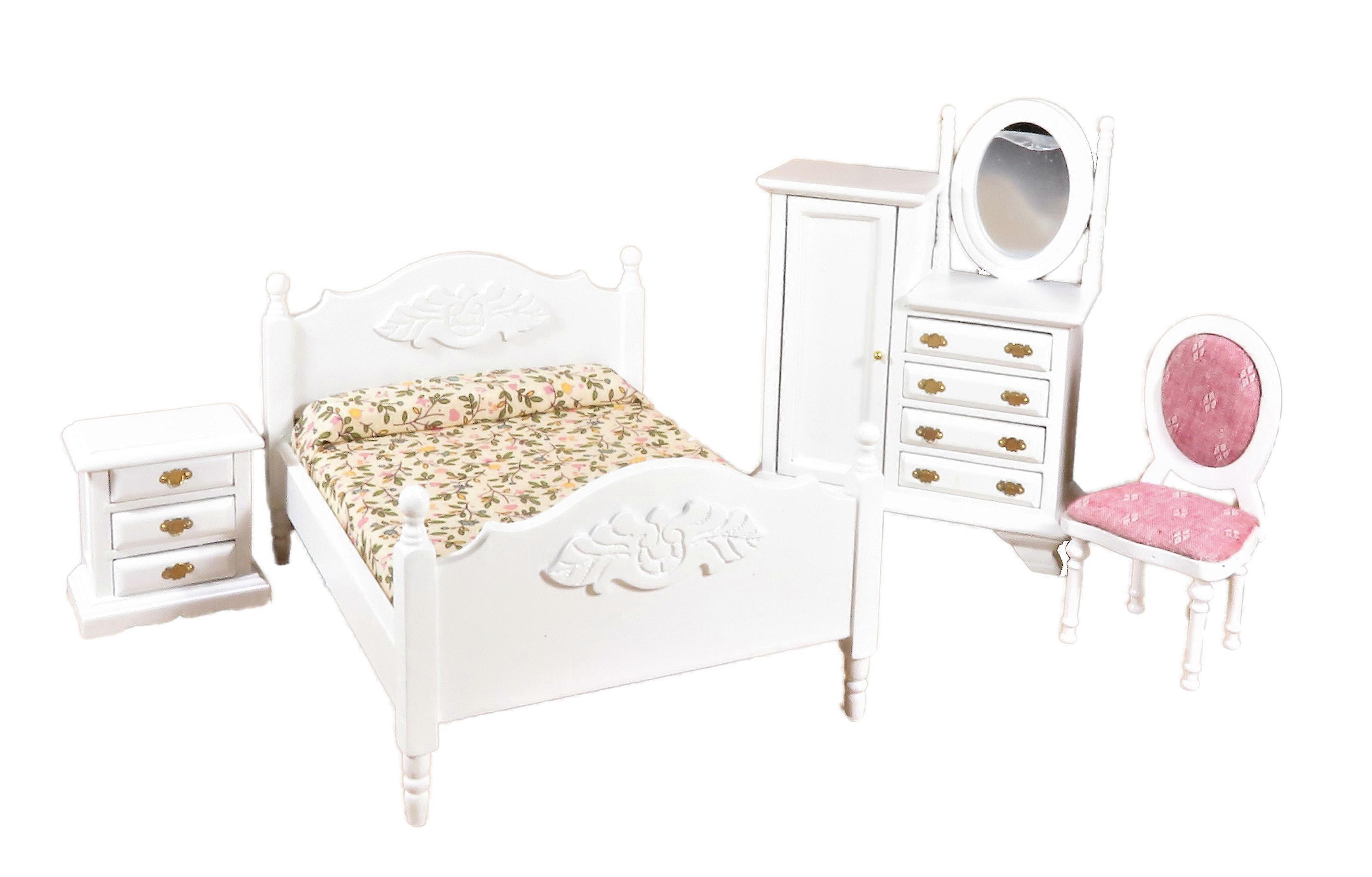 Dolls House White Double Bedroom Furniture Set With Combination Wardrobe 1:12