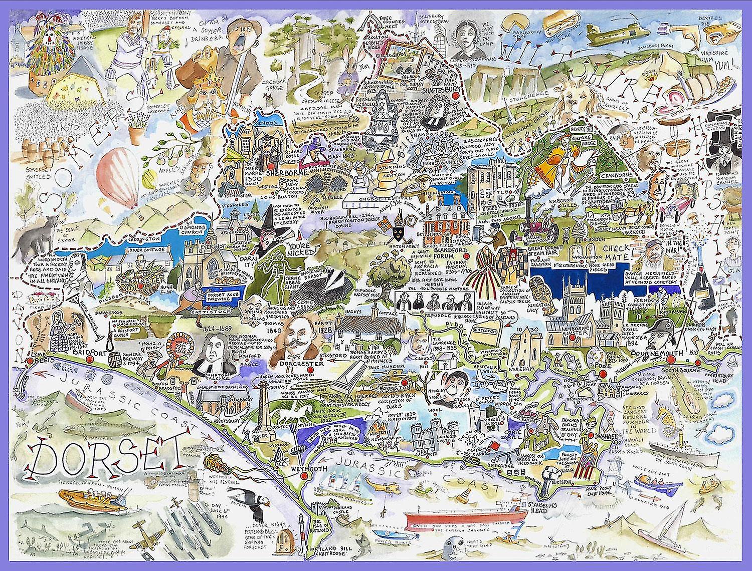 Dorset is a comic 1000 piece quality jigsaw puzzle from Tim Bulmer’s Map Collection.Explore the beautiful county of Dorset in this fun-filled 1000 piece jigsaw puzzle.From the Jurassic Coast to Monkey World, Dorset is a county well worth exploring with breathtaking views and all kinds of fascinating attractions. In this extremely detailed map of Dorset, illustrated by Tim Bulmer, you will also find glimpses into the neighbouring counties of Somerset and Wiltshire. Did you know? Dorset is home to Hugh Fernly Wittingstone's River cottage‚, the seaside town of Bournemouth and the Cerne Abbas Giant Tim Bulmer is a talented artist who is known for his witty and humorous artwork. Tim doesn’t take life too seriously as can be seen in his artwork which reflects his light-hearted attitude. His amusing designs will have you giggling while you piece together the puzzle.Completed Puzzle Size: 66 x 50cm