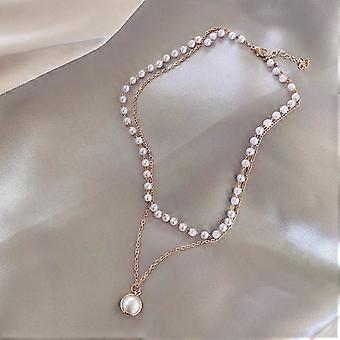 Double-Layer Pearl Pendant Necklace-Simple Beaded Design in Gold Gold