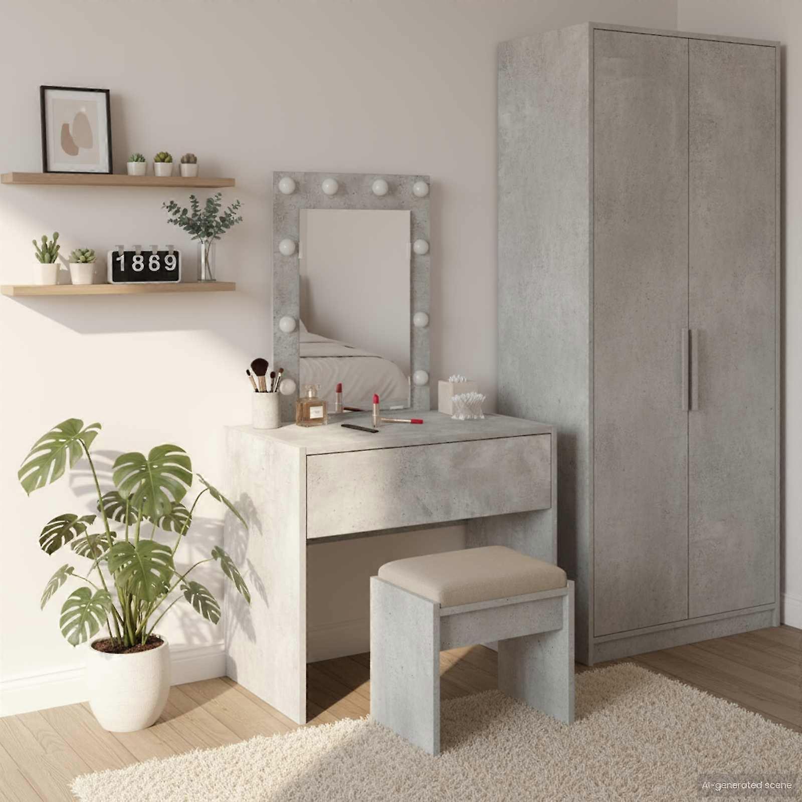 Farbe: GrauMaterial: HolzwerkstoffGesamtabmessungen: 60 x 40 x 70 cm (L x B x H)Gewicht: 14,2 kgStauraumLanglebigStromquelle: USBLichttyp: Spiegelbeleuchtungmit 1 SchubladeFlachspiegelRahmenmaterial: HolzwerkstoffNur für den InnenbereichLieferumfang:1 x SchminktischMontage erforderlich: Ja