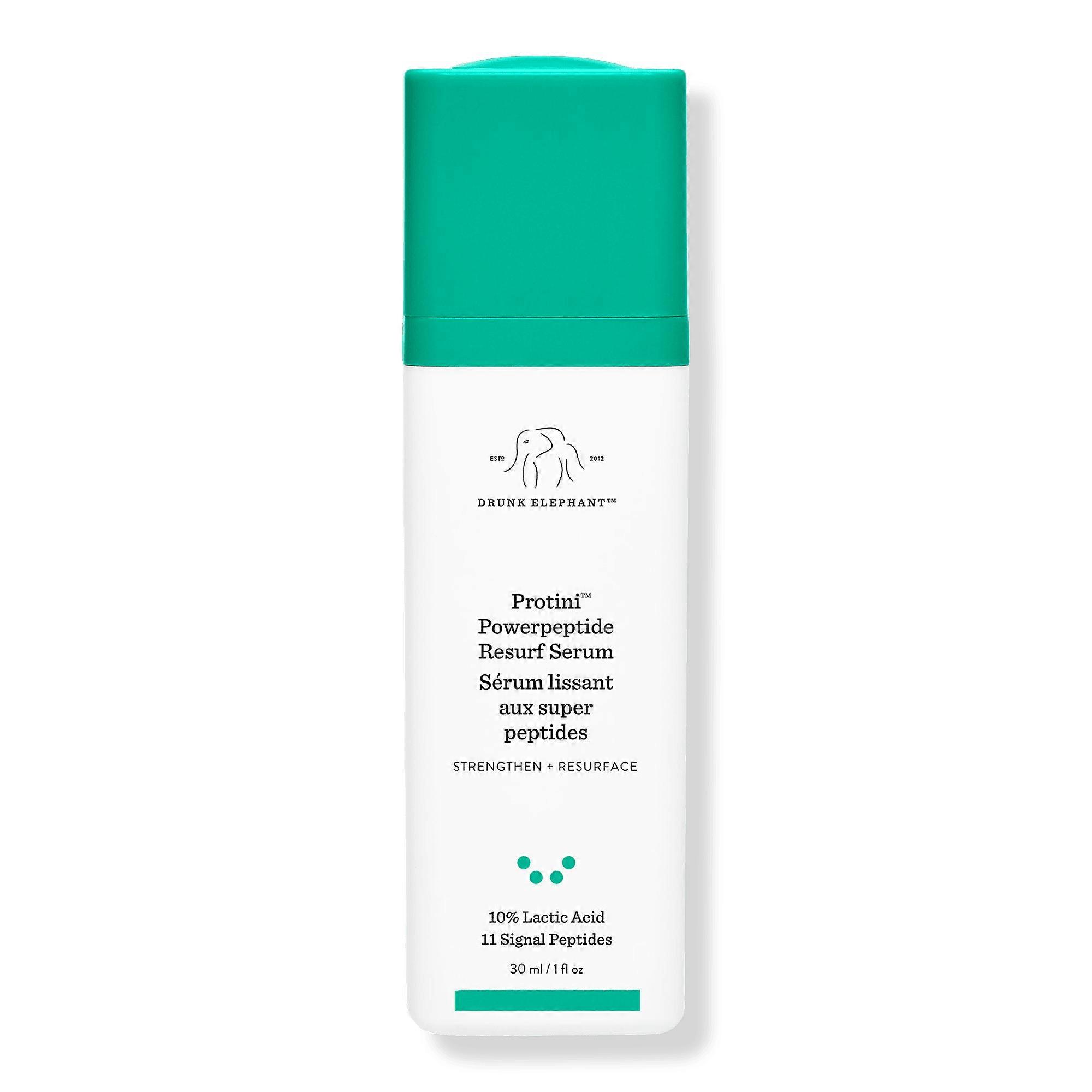 Drunk Elephant's Protini Powerpeptide Resurf Serum combines skin-fortifying signal peptides, growth factors, and amino acids with exfoliating 10% lactic acid for a dramatic improvement in the appearance of skin's texture, tone, radiance, and bounce. Benefits Targets a dull, uneven complexion to give plump, bouncy skinImproves appearance of fine lines, sun damage, and enlarged poresReplenishes hydration levels, adding lightweight moistureBoosts radiance and restores a natural, healthy-looking glowFormulated at a skin-friendly pH of 3.5Vegan and cruelty-freeRecyclable packagingAward winner: Harper's BAZAAR Anti-Aging Award 2021, New Beauty Beauty Award 2021, SheFinds Best New Beauty Award 2021 Key Ingredients Lactic Acid (10%): Derived from the fermentation of sugar, lactic acid is an AHA (alpha hydroxy acid) that exfoliates the skin by dissolving the bonds that hold dead cells together. Lactic acid is considered to be a milder, more hydrating AHA.Signal Peptide Complex: 11 signal peptides (made up of amino acids, which form proteins in the skin) and safe, plant-derived growth factors help to boost skin's self-renewal, binding moisture to skin and plumping, firming & restoring bounce.Multi-Amino-Acid Blend: A mix of quick-absorbing amino acids soothes, strengthens, and moisturizes skin. Formulated Without Made without the Suspicious 6 - the six ingredients Drunk Elephant believes are at the root of almost every skin issue (Essential oils, Silicones, Chemical sunscreens, SLS, Fragrances + dyes, and Drying alcohols) Inactive Ingredients: Aqua (Water), Alcohol, Acrylates Copolymer, Amp-Acrylates Copolymer, Hydroxyethylcellulose, Phenoxyethanol, Peg-12 Dimethicone, Caprylyl Glycol, Panthenol, Butylene Glycol, Gossypium Herbaceum (Cotton) Extract. Product ingredient listings are updated periodically. Before using a Benefit Product, please read the ingredient list on the packaging of your product to be sure that the ingredients are appropriate for your personal use. Suggested Use: Shake gently before use. Apply to a clean, dry face, avoiding the eye area. May also be applied to the chest and backs of hands. Follow (or mix) with your choice of Drunk Elephant moisturizer. During the daytime, may also be combined with C-Firma Day Serum for added brightening and firming benefits. Follow with Umbra. Protini Powerpeptide provides gentle chemical exfoliation on its own, so it is not necessary to also use T.L.C. Framboos or Babyfacial on the same day. How to Recycle: Pop off the top. Unscrew the clear vial from the top. Recycle the vial + outer container. UPC: 000002588475 Weight: 0.57 lbs