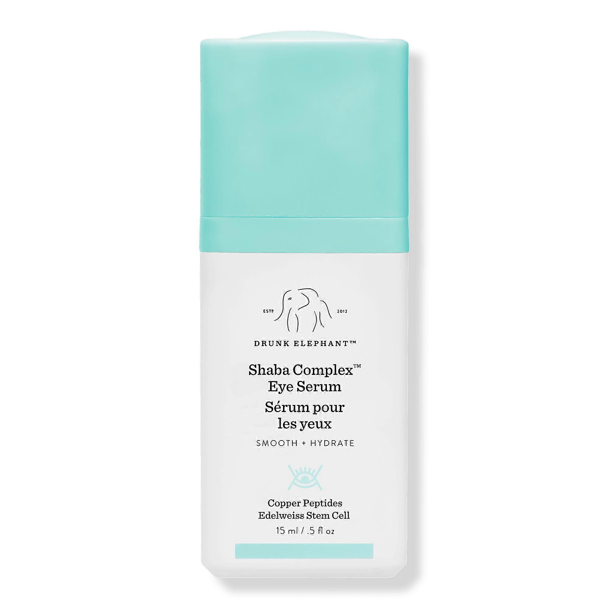 Drunk Elephant's Shaba Complex is a satiny eye serum formulated with powerhouse ingredients to tackle the major signs of aging under and around the eyes, such as fine lines, wrinkles, and sun damage. The result is a rested, more youthful appearance. Benefits Formulated with potent doses of black tea ferment, niacinamide, copper peptides and edelweiss stem cellsSoothes, smooths, and hydrates for a smoother, more youthful look around the eyesMinimizes the appearance of fine lines, wrinkles, and sun damageHelps prevent premature signs of aging from environmental aggressorsFormulated at a skin-friendly pH of 5.8Vegan and cruelty-free Key Ingredients Copper Peptides: Reduce the appearance of wrinkles and promote a more elastic feel to the skinLeontopodium Alpinum (Edelweiss) Meristem Cell Culture: Soothes while powerful antioxidants combat visible signs of agingBlack Tea Ferment: Smooths skin roughness, visibly improves radiance, and decreases glycation - a process that has been shown to age the appearance of skin Formulated Without Made without the Suspicious 6 - the six ingredients Drunk Elephant believes are at the root of almost every skin issue (Essential oils, Silicones, Chemical sunscreens, SLS, Fragrances + dyes, and Drying alcohols) Inactive Ingredients: Aqua (Water), Mica, Glyceryl Stearate, Polypropylene, Magnesium Aluminum Silicate, PEG-100 Stearate, Polyacrylamide, Phenethyl Alcohol, C13-14 Isoparaffin, Glyceryl Caprylate, Laureth-7, Panthenol, Glycerin, Silica, Althaea Officinalis Root Extract, Citric Acid, Potassium Sorbate, Sodium Benzoate. May Contain: CI 19140 (Yellow 5, Yellow 5 Lake), CI 42090 (Blue 1 Lake), CI 77000 (Aluminum Powder), CI 77007 (Ultramarines), CI 77163 (Bismuth Oxychloride), CI 77288 (Chromium Oxide Greens), CI 77289 (Chromium Hydroxide Green), CI 77491, CI 77492, CI 77499 (Iron Oxides), CI 77510 (Ferric Ferrocyanide, Ferric Ammonium Ferrocyanide), CI 77742 (Manganese Violet), CI 77891 (Titanium Dioxide) Product ingredient listings are updated periodically. Before using a Benefit Product, please read the ingredient list on the packaging of your product to be sure that the ingredients are appropriate for your personal use. Suggested Use: Apply under the eye, around the orbital bone, and on the eyelid each morning and night for a refreshing boost to the eye area. May be mixed with C-Tango Multivitamin Eye Cream. Tip: Leave Shaba Complex in the fridge for a cooling, soothing treatment. UPC: 000002588446 Weight: 0.53 lbs