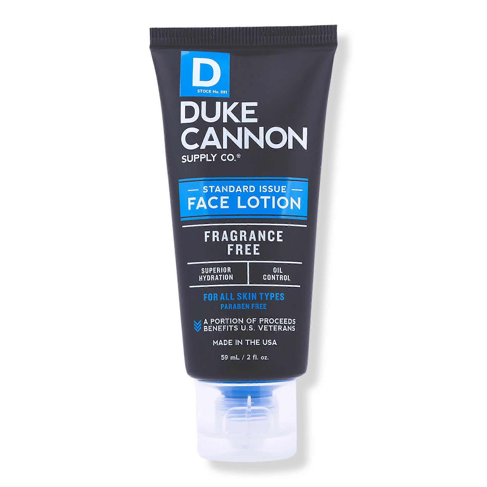 Hard-working folks don't have time to obsess over a fancy skin care regimen; they need a simple straightforward defense. Standard Issue Face Lotion from Duke Cannon Supply Co. is formulated to provide instant long lasting hydration while reducing excess oil and shine. Now in travel size Features Standard Issue Face Lotion is formulated to provide instant, long-lasting hydration while reducing excess oil and shineIt goes on smooth and lightweight without leaving a greasy residuefragrance free Key Ingredients Protein-complex minerals to repair dehydrated skinApricot kernel seeds absorb excess oil for anti-glare / matte finishAntioxidants to rehydrate and fight fatigue Inactive Ingredients: Paraffinum Liquidum (Mineral Oil), Triisononanoin, Cetearyl Ethylhexanoate, Isopropyl Myristate, Retinyl Palmitate, Tocopheryl Acetate, Anthemis Nobilis Flower Oil, Lavandula Angustifolia (Lavender) Oil, Rosmarinus Officinalis (Rosemary) Leaf Oil, Calendula Officinalis Flower Extract, Helianthus Annuus (Sunflower) Seed Oil, Glycine Soja (Soybean) Oil, BHT, Bisabolol, Parfum (Fragrance). UPC: 000002540530 Weight: 0.63 lbs