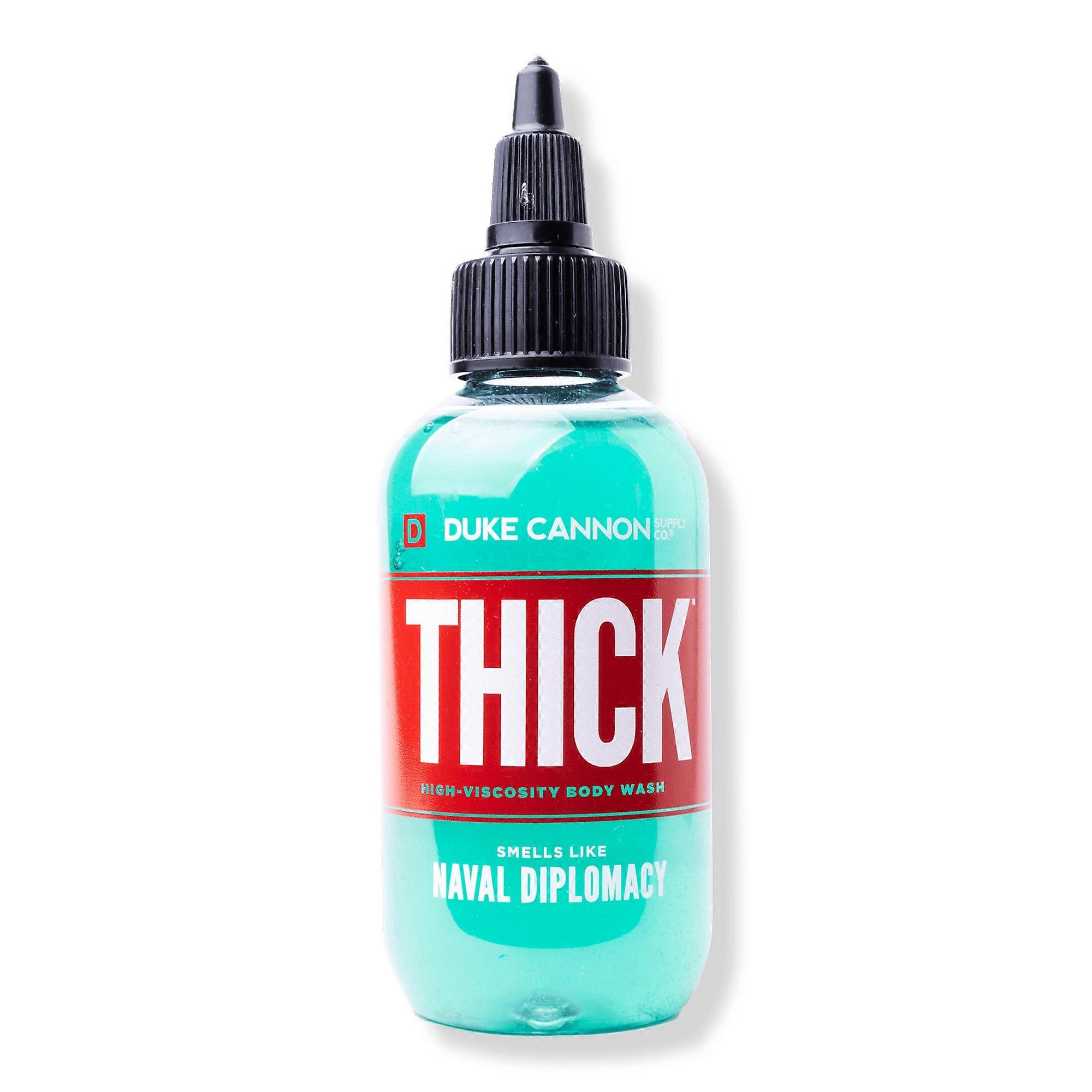 Duke Cannon Supply Co.'s THICK Naval Diplomacy High-Viscosity Body Wash is formulated with a noticeably higher viscosity and built to work effectively on your body, not spew down the shower drain. The aquatic scent blends notes of fresh water, open-air, and bergamot. Smells like Naval Diplomacy.