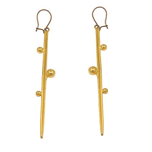 Diese goldfarbenen Modeschmuck-Ohrringe sind ein echter Blickfang Der Ohrhänger besteht aus einem vergoldeten Stab mit drei versetzt angebrachten Kugeln, das Grundmaterial ist eine Messinglegierung. Das Ohrpendel ist an einem goldfarbenen Ohrhaken aus Messing befestigt, Gesamtlänge mit Haken 80mm, somit fällt der Ohrhaken auch bei längerer Haarfrisur auf und spielt angenehm am Hals. Ohrschmuck betont zusätzlich das Gesicht und rundet Ihren Auftritt glanzvoll ab. Verkauf paarweise. Abmessung: 80mm Material: einfaches Metall Verschluss: Haken Preis per 1 Paar