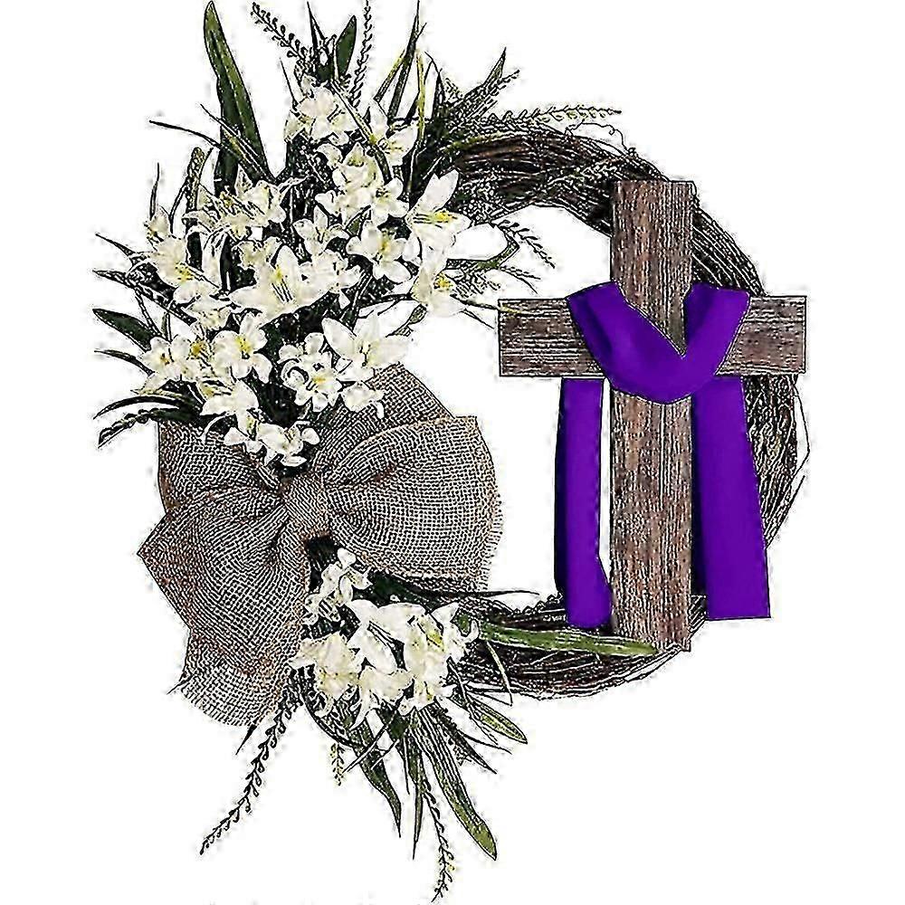 Easter Wreath Door Hanging Decoration with Cross, Garland for Front Door Decor, Flower Decorations Grape Vines Wreath