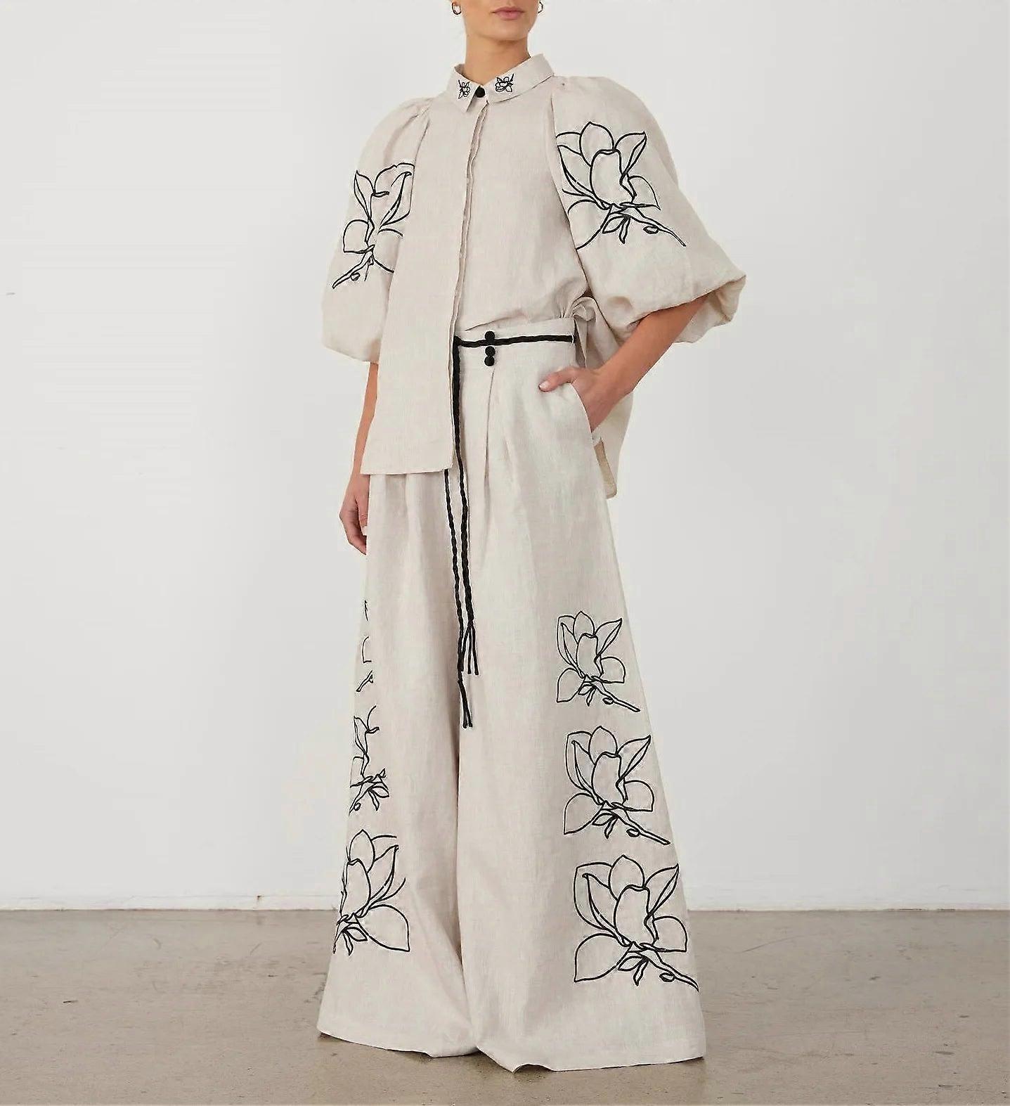 Elegant Women's Cotton Linen Two-piece Set: Loose Long Sleeve Printed Shirt &