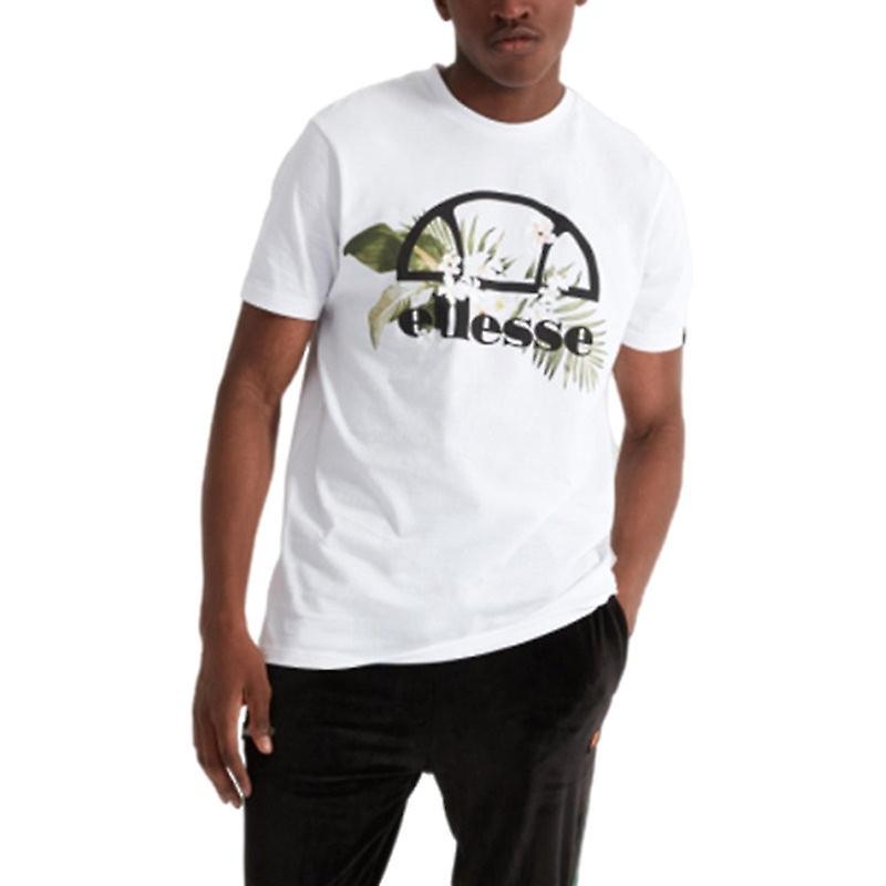 Add summer vibes to your t-shirt collection with the Forli tee. This design features the Ellesse logo across the centre with a floral pattern bursting through the semi palla. Complete with a ribbed neck, this piece is the perfect tee to see you through the warm weather. The Forli T-Shirt from Ellesse. Featuring a floral motif and the traditional logo. Adds a fresh, unique twist to a sportswear classic.   Men's T Shirts 100% Cotton Floral Motif Monotone Logo Logo Tab To Sleeve Crew Neck Short Sleeve Machine Wash Do Not Tumble Dry Size: S Colour: White         SIZE  TO FIT CHEST:  SIZE           Inches            CM   S               36-38             91-96