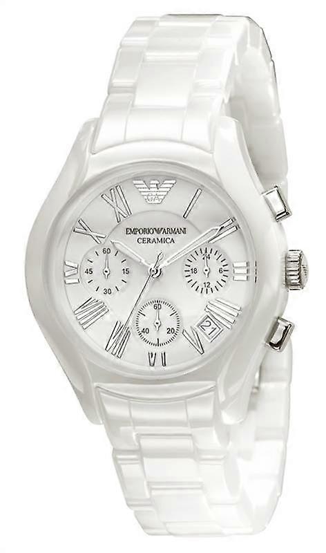 White Emporio Armani ladies chronograph watch from the Ceramica collection. This beautiful watch features a white dial with three sports subdials set within a white ceramic case. The hours are marked with roman numerals and the date is displayed at the four o'clock position. The watch is secured by a highly scratch resistant white ceramic bracelet fastened with a deployment clasp. Water resistant to 30 metres.