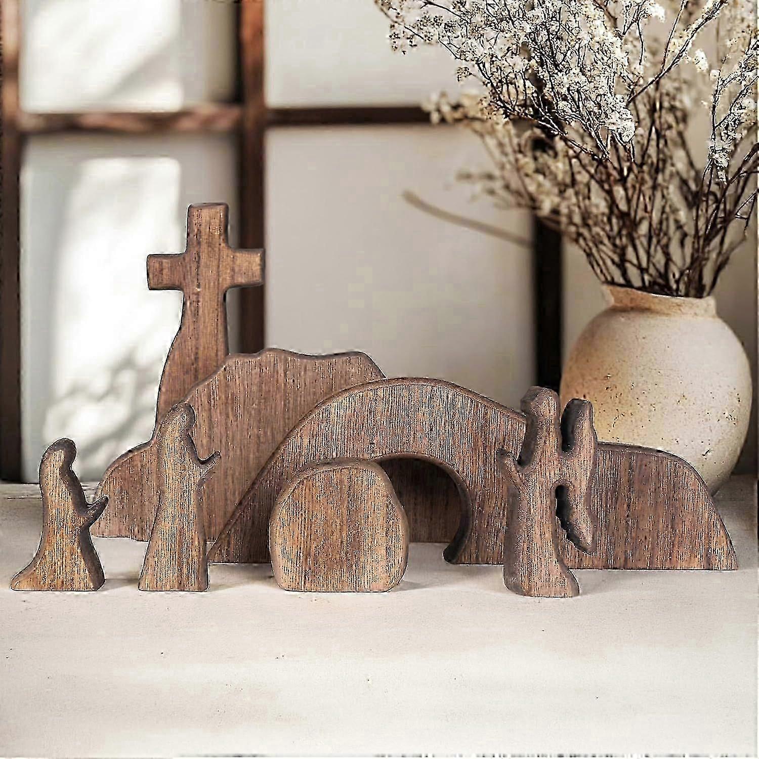 Empty Tomb Easter Scene and Cross Wooden Ornament, Easter Resurrection Scene Cross Jesus Tomb Tray DecorationEaster Decorations: This beautifully crafted wooden Easter Resurrection Scene features an empty tomb and a cross, symbolizing the resurrection of Jesus Christ. Adding a touch of faith and reverence to your decor.Exquisite Design: Made from premium wood, this resurrection set features smooth finishes and sturdy construction, ensuring that it remains a timeless and durable addition to your seasonal decorations.Distinctive Scene Design: This Easter Nativity scene showcases a captivating and visually striking design. Made up of 7 individual pieces, come together as a complete and cohesive display. It creates a meaningful Christian decoration, embodying the spirit and message of the resurrection.Perfect Tabletop Size: Designed to fit perfectly on tables, shelves, or mantels, this decoration adds a spiritual touch to any room without taking up too much space. Ideal for homes, offices, churches, or prayer rooms.Thoughtful Gift Option: This Easter scene makes a thoughtful and meaningful gift for friends, family, or anyone who appreciates religious art and decor. It is perfect for Easter, Christmas, or any occasion where you want to share a message of faith and hope.Specification:Material: WoodPackage Includes:1 x Easter Resurrection Scene SetNote:1. Due to the different monitor and lighting effect, the actual color of the item may be slightly different from the color shown on the pictures.2. Please allow 1-3cm error due to manual measurement. (1 inch = 2.54 cm)Thanks for your support :)