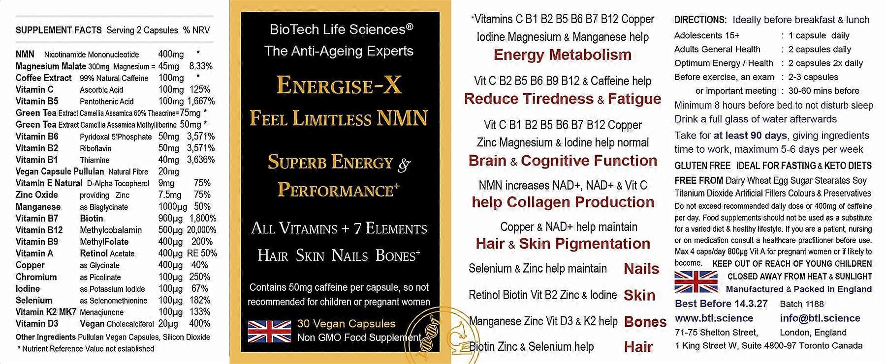 Energise-X Feel Limitless Max Energy No Fatigue 30 caps NMN + Vits by BioTech Life Sciences is a premium dietary supplement designed to support maximum physical energy and enhanced mental performance. Formulated with NMN and CoQ10, this advanced blend promotes cellular energy production and combats fatigue, helping you feel revitalized and focused throughout the day.Enriched with a comprehensive spectrum of essential vitamins including Vitamin A (Retinol), Vegan Vitamin D3, Vitamin K2, and a full B-complex range (B1, B2, R5P, B5, B6 PLP, B7 Biotin, B9 MethylFolate, B12), this supplement supports overall health, cognitive function, and immune system resilience.Additional key minerals such as Iodine, Zinc, Magnesium, Copper, Chromium, Manganese, and Selenium contribute to optimal metabolic function, antioxidant protection, and balanced nutrient absorption. Together, these ingredients work synergistically to reduce tiredness, enhance stamina, and promote mental clarity.Ideal for individuals seeking to overcome daily fatigue, improve workout recovery, or enhance cognitive focus during demanding tasks. Energise-X is suitable for adults who want to maintain peak energy levels and support healthy aging through scientifically backed nutritional support.Each capsule is carefully formulated to maximize bioavailability and effectiveness, making Energise-X a reliable addition to your daily wellness regimen. Take one capsule daily with water, preferably alongside a meal, to experience sustained energy and mental alertness without the jitters or crashes commonly associated with stimulants.Unlock your full potential with Energise-X Feel Limitless Max Energy No Fatigue the natural way to energize your body and mind.