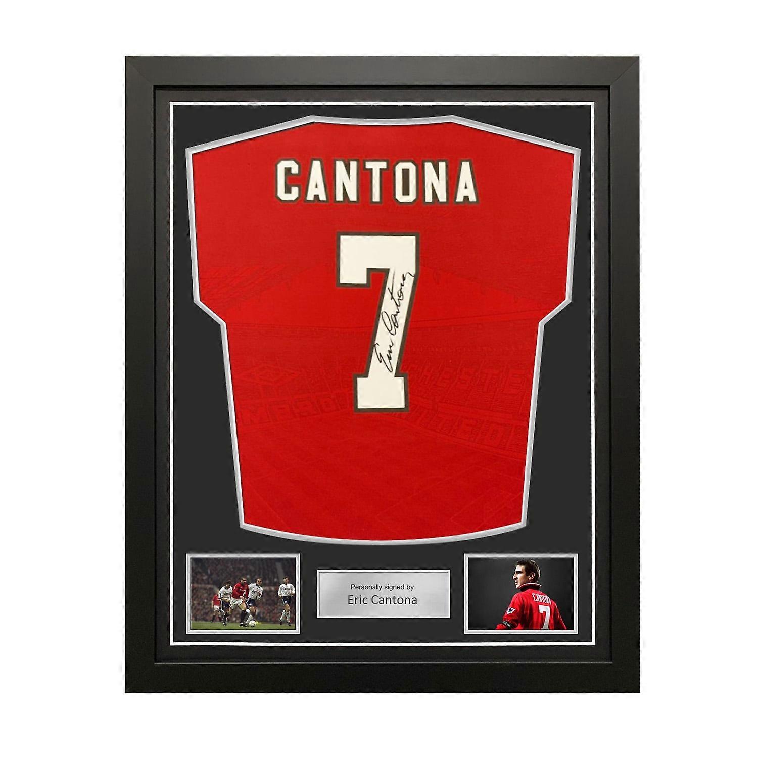 Original Manchester United 1994-96 home football shirt, fan style printing, signed by Eric Cantona. In standard black frame. Approximate size: 840 x 670 mm / 33 x 26.5 inches / This original Manchester United shirt was signed by Eric Cantona in Paris on December 2nd 2025. This style of shirt was worn by United when they beat Liverpool in the 1996 FA Cup final. Eric scored the only goal in the 85th minute, winning the game for United. United also won the league this season, making them the first club to win the Double twice and Cantona the first FA Cup-winning captain from outside the British Isles. All signatures are originals they are never printed. The product image is a stock photo so the position of signatures might vary slightly. Exclusive Memorabilia unconditionally guarantees all signed items are genuine. The item will come with a certificate of authenticity featuring a numbered hologram that matches an identical hologram affixed to the product. Exclusive Memorabilia is the UK's most trusted brand of sports and entertainment memorabilia, supplying Premiership football clubs, leading cruise lines and charities with their memorabilia for sale and auction.