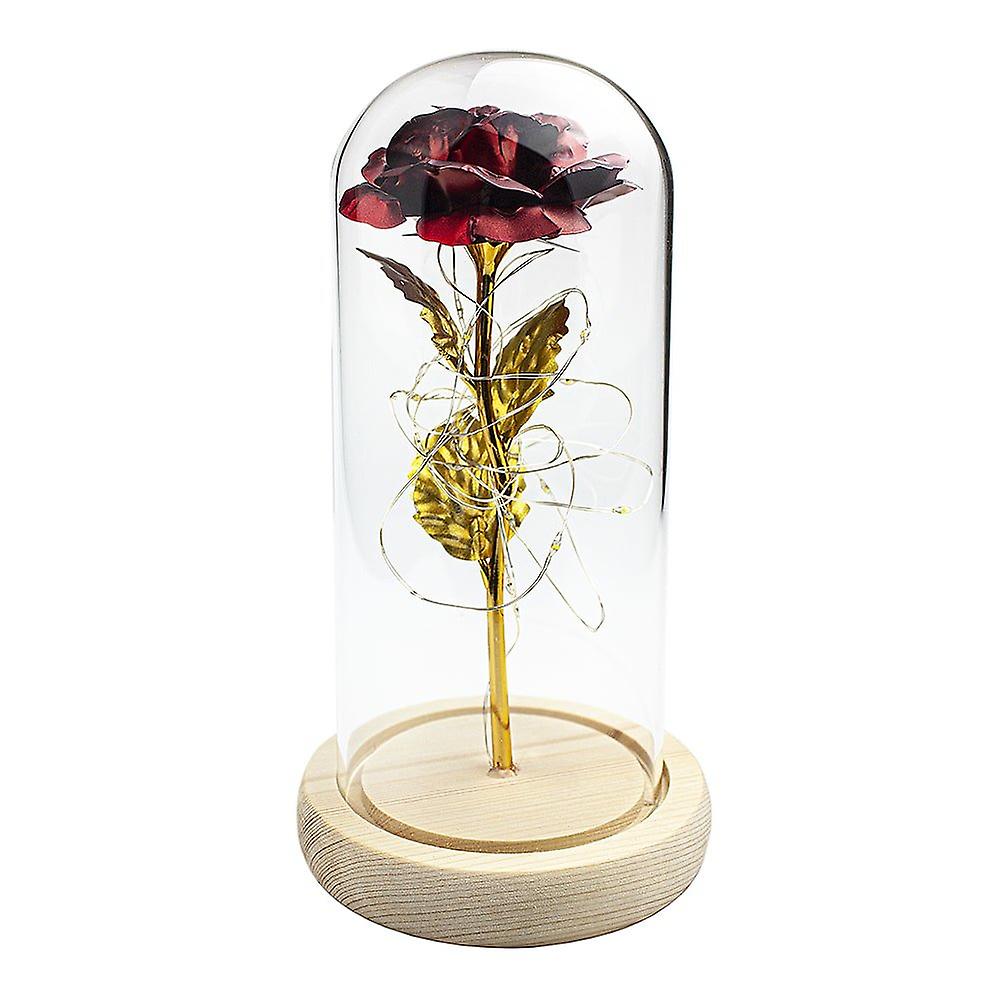 Uppvakta någon du tycker lite extra om med denna röda evighetsros med guldig stjälk. Rosen sitter på en bas av trä och omsluts av en avtagbar glaskupa. Slingrandes runt rosen finns en tunn ljusslinga, som kommer ge rummet en mysig stämning. Passar utmärkt att ge bort som present vid bröllop, förlovning, Mors dag eller Alla hjärtans dag - Röd ros med guldig stjälk, inuti en glaskupa - En tunn ljusslinga lyser upp rosen - Passar som present vid bröllop, förlovning eller Alla hjärtans dag Specifikationer: Färg: Röd Material: Glas, trä Mått: Ca. 21 x 11 cm Batterier: 3x AAA (medföljer ej) Förpackningen Innehåller: 1x Evighetsros