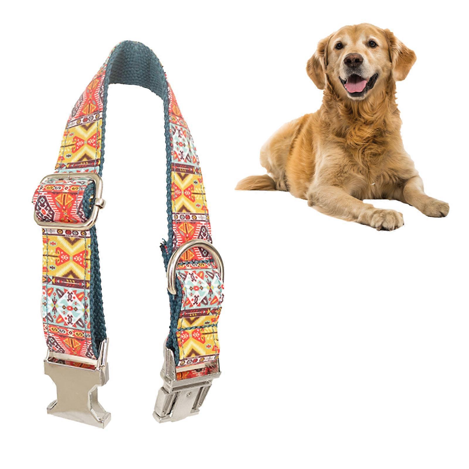 Features: Ethnic style collar with metal D-ring for attaching a lanyard or badge. A sturdy metal buckle allows you to quickly remove the collar in an emergency. Made of high quality durable woven tape and comfortable fabric outside. Combined with good stitching to guarantee strength and durability.5 sizes available, adjustable for most dogs. Specification:Material: Fabric + Woven Tape + Alloy Color: As shown in the picture Size: XS, S, M, L, XL (optional)Size width neck circumferenceXS 2.0cm 23-30cmS 2.0cm 31-41cmM 2.5cm 42-48cmL 2.5cm 49-55cmXL 2.5cm 56-62cmNote: Please allow 1-3cm (0.4-1.18") difference due to manual measurement and slight color change for different display setting.