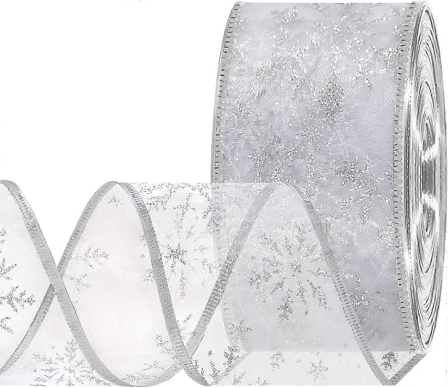 ETIA Silver Wired Christmas Ribbon - Snowflake Sheer Glitter Ribbon for Christmas Tree, Gift Wrapping, Christmas Decorations - 2.5 inch x 50 Yards Sil
