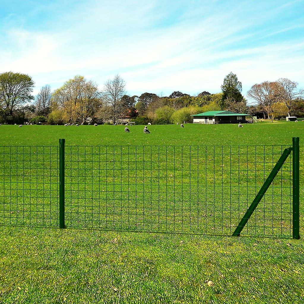 Farbe: GrünMaterial: Stahldraht, PVC-beschichtetZaunlänge: 25 mZaunhöhe: 0,8 mMaschenweite: 100 × 100 mm (L × B)Drahtdurchmesser: 1,8/2,2 mm (1,8 mm Stahldraht, 2,2 mm PVC-Schicht)Pfosten-Durchmesser: 34 mmLieferung beinhaltet:1 x PVC-beschichteter Eurozaun11 x Gerader Pfosten, 1,25 m2 x Pfahlpfosten, 1,15 m