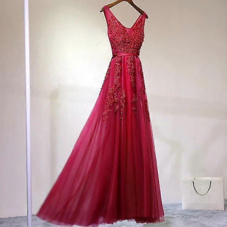 Evening Dress-Sexy V-neck Tulle Applique Robe in Red Wine-Red Wine,S