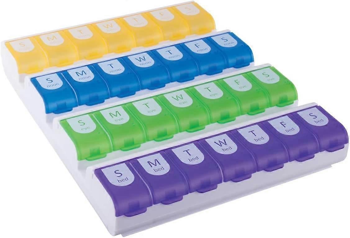 REMOVABLE TRAY & EASY USE - Contoured bottoms make medication easy to retrieve and a fully opening back tray allows you to refill the organizer quickly DAILY 4-DOSE REMINDERS - 4 daily compartments help you to easily plan and distribute your more frequent doses LARGE COMPARTMENTS - The planner can fit 30 aspirin and has plently of space for all of your daily medication BUILT TO LAST - This product has a high quality design and is made for repeated use Perfect for planning multiple medication doses throughout the day